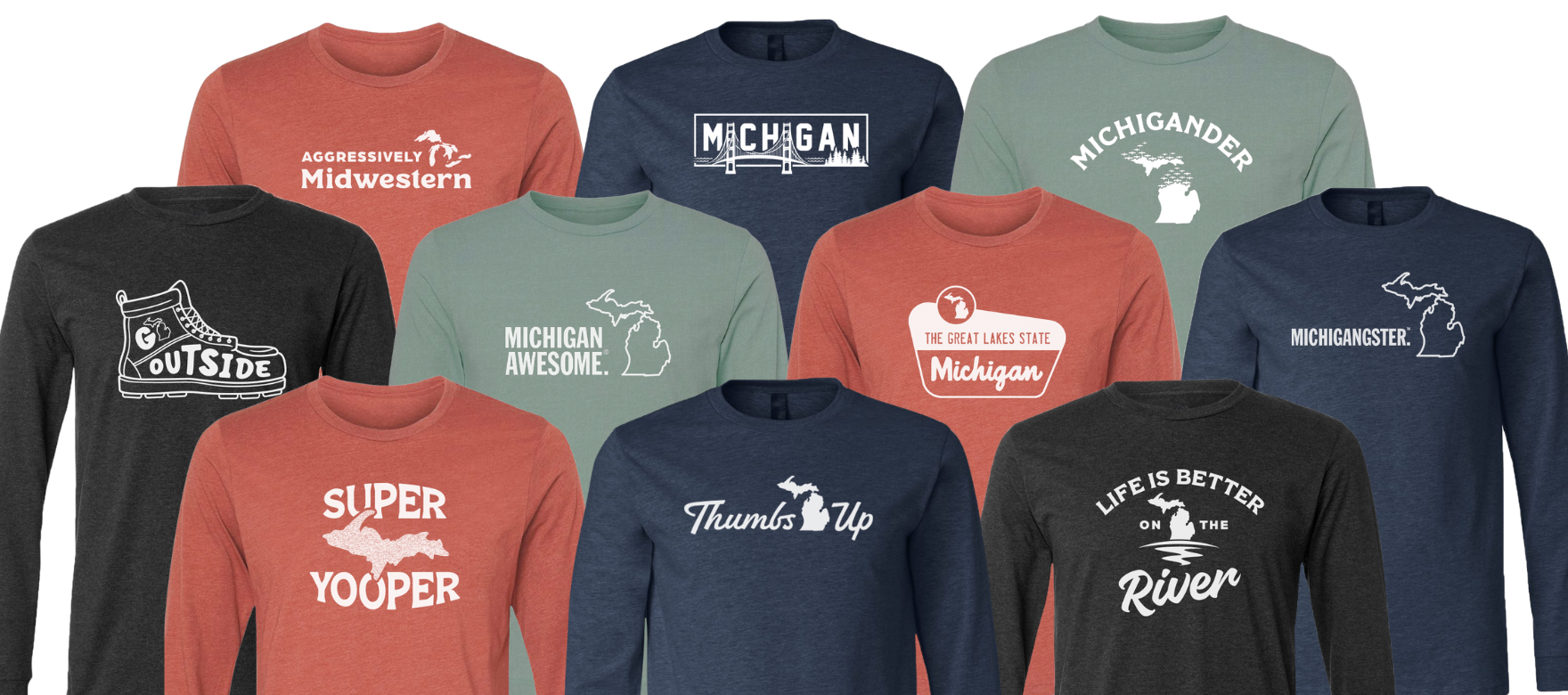 Catchy Michigan designs printed on high-quality 52/48 combed and ringspun cotton/polyester shirts in unisex sizes. Click on your favorite shirt to see more color options. Wear with pride!