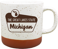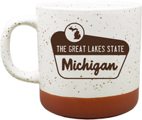 Sip your favorite warm beverage in a new Michigan Mug! Holds 12 fluid ounces. Features our "Michigan Park Sign" design on both sides. Ceramic mug with speckled satin finish and unglazed terra cotta bottom. Microwave safe. Hand wash recommended. Sip with pride!