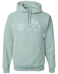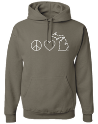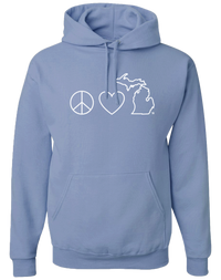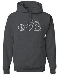 Peace. Love. Michigan. What else is there? Cotton/Polyester blend fleece. Unisex sizes.